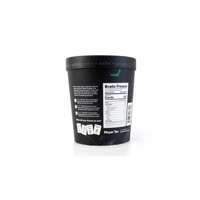The speak-before-you-think party game. Get to know friends and family better - when the fastest answer wins, you never know what they’ll let slip. Fast-action group game - get your friends and family shouting out the hilarious answers that are top of mind. Create interesting conversation - revealing personal answers spark fun discussions between players. Start playing quickly - simple game play will have you playing in seconds. 20-30 minutes | 17+ (Adults Only!) | 3+ Players | 120 Cards Brain Freeze can get surprisingly dirty so watch out!